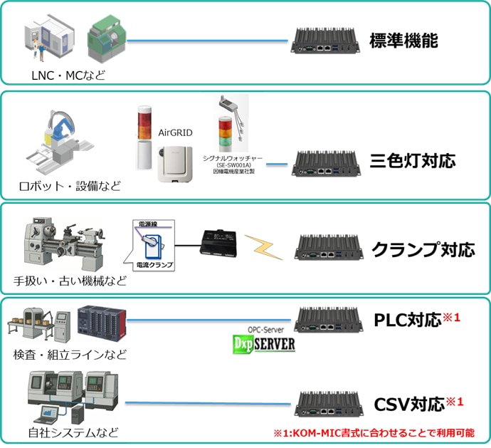 その他 | 三色灯(パトライト/AirGrid)、電流センサ、 バーコードリーダ、 PLC(個別対応) |