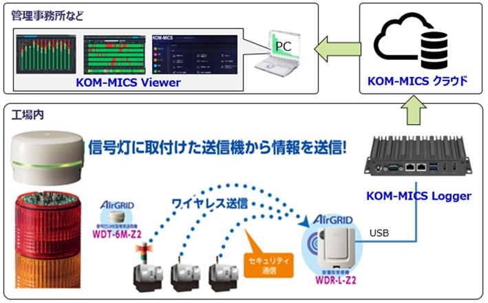 ◆パトライト製無線機能付き信号灯の信号を集約して、加工機械の稼働状況を他のKOM-MICS端末と同じGUIで可視化ができる機能