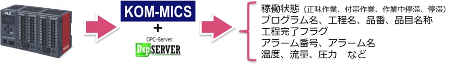 ◆三菱電機もしくはオムロン、キーエンスなどのPLCを用いてPLC内のデータレジスタの情報をKOM-MICSに取込むことで三色灯や電力クランプセンサーよりも詳細な情報を収集する機能